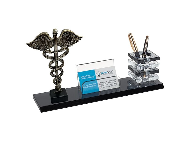 מעמד קריסטל "סמל הרפואה" עם כוס לעטים ומעמד לכרטיסי ביקור