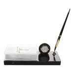 מעמד שיש שולחני עם עט, דפי ממו ושעון