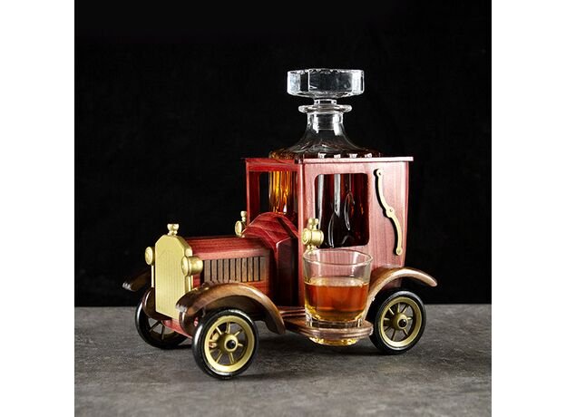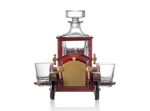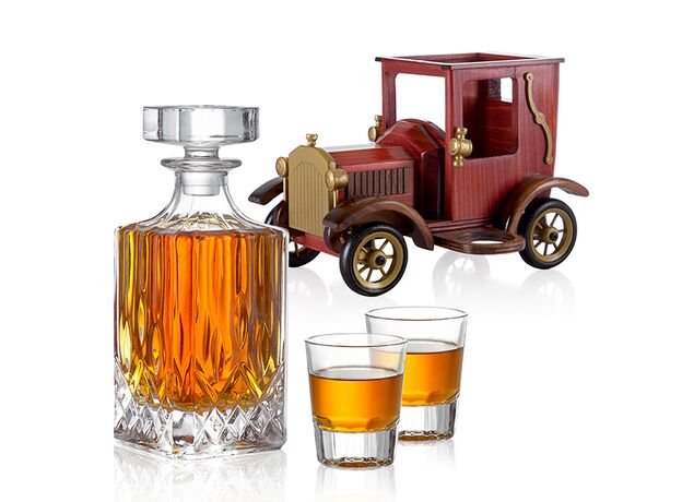 סט מתנה דיקנטר ויסקי 700cc עם שתי כוסות במעמד מכונית עץ עתיקה