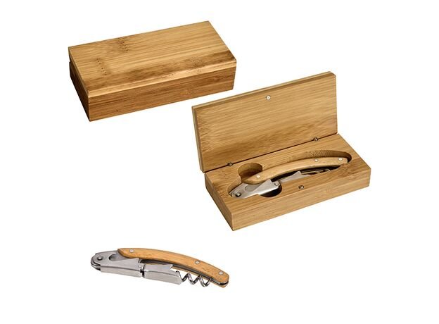 מארז איכותי ויפה מעץ במבוק מכיל פותחן מלצרים.
